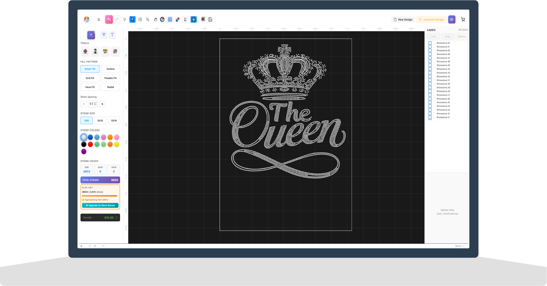 Powerful rhinestone design tools like curved text, clipping masks, advanced gradients, rhinestone patterns, and more.